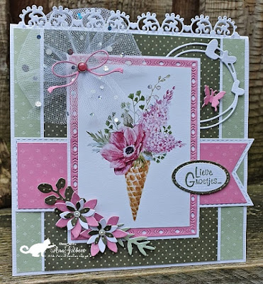 De kaart blijft staan tegen de van Harte stans, die ik verhoogd heb opgeplakt met foam. De kleine zalmkleurige bloemetjes zijn van Hobbycraft. Ik hoop dat ik mijn voorraad weer aan kan vullen als we in Engeland zijn, jammer is dat deze hobbywinkels, vaak in grote shopping malls zitten buiten het centrum, maar we gaan het zien..